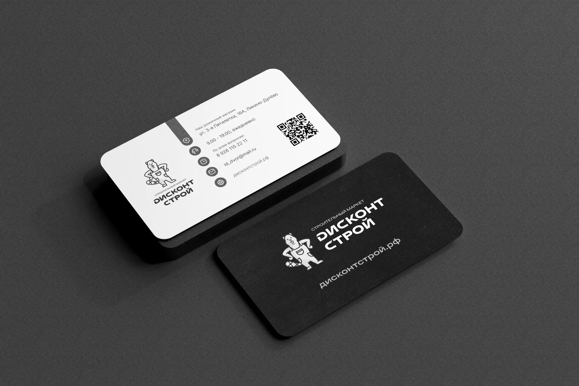 Вместе с логотипом, мы предложили заказчику сразу визуализацию логотипа в возможном дизайне на фирменный визитках магазина «Дисконт Строй» в Озёрске.